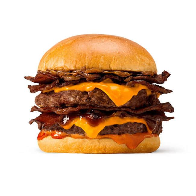Three layers of pure burger bliss, stacked high with succulent patties and irresistible toppings. Bite into burger paradise!