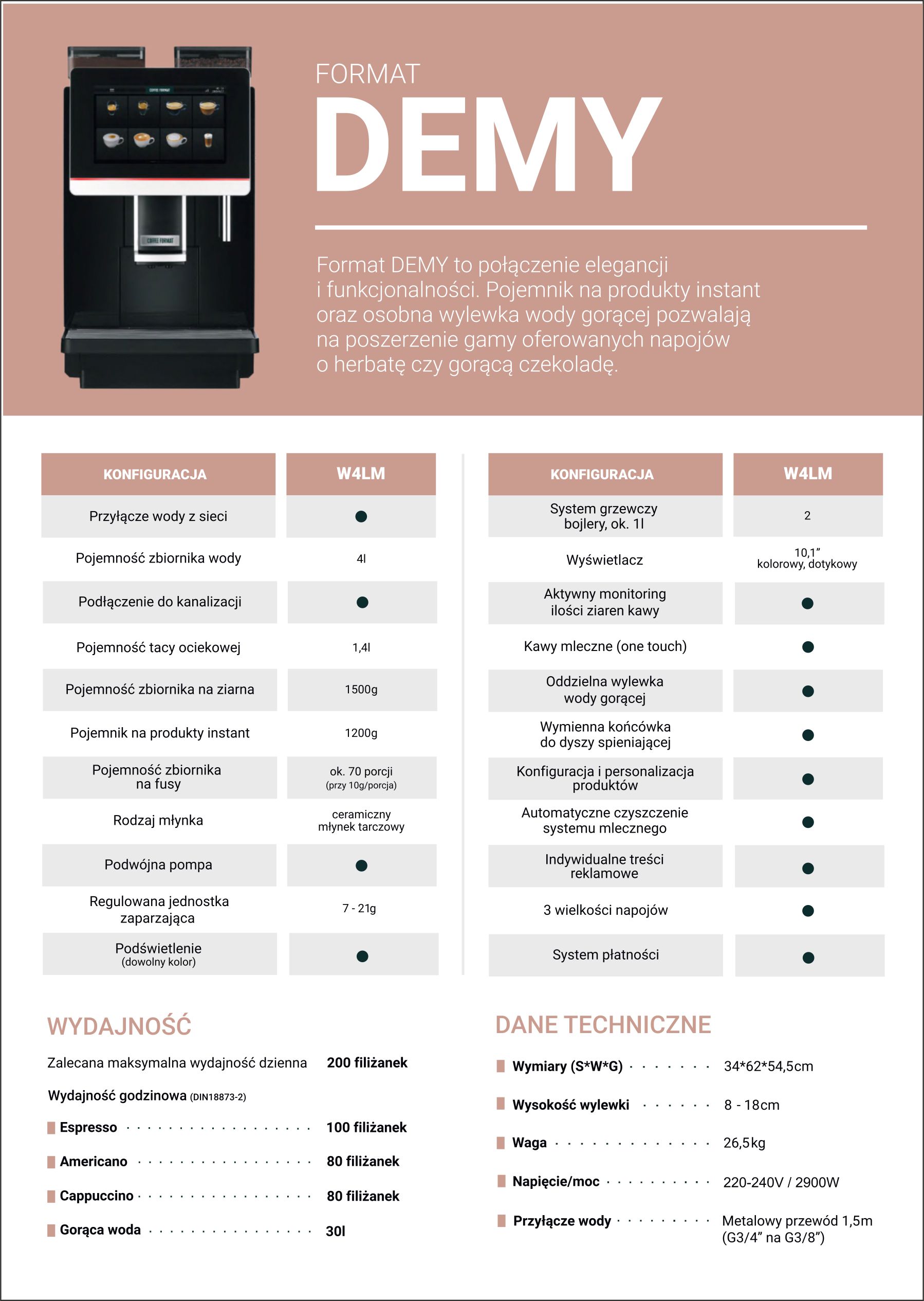 Takie rozwiązania sprawiają, że Coffee Format Demy jest urządzeniem niezawodnym, wszechstronnym i gotowym do intensywnej, codziennej pracy.